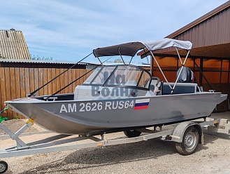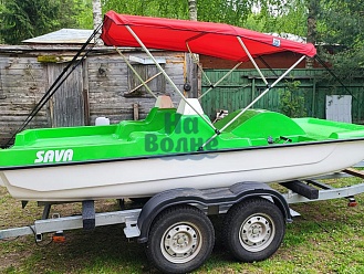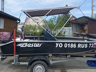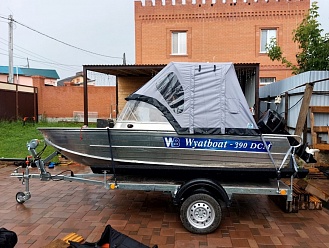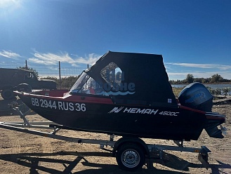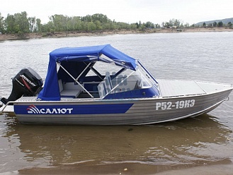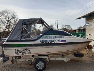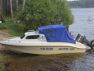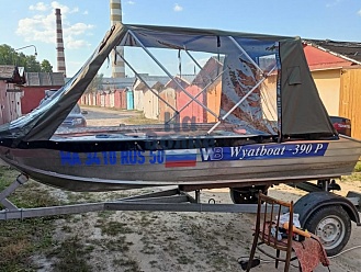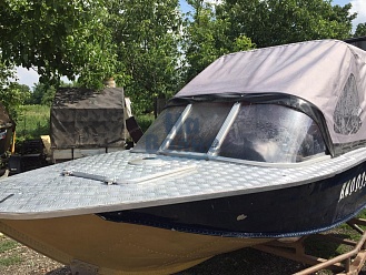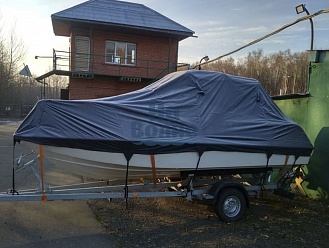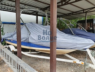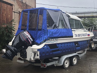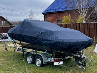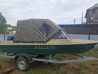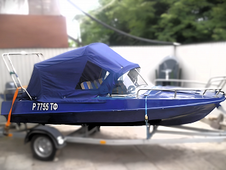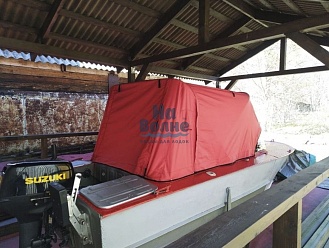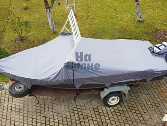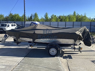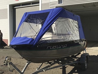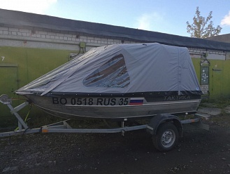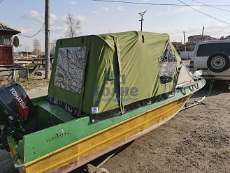 Тент с задней дверью для выхода к мотору, небольшими боковыми окнами и усиленными краями для установки застёжек. Изготовлен из специализированной тентовой ткани Оксфорд 600 повышенной плотности